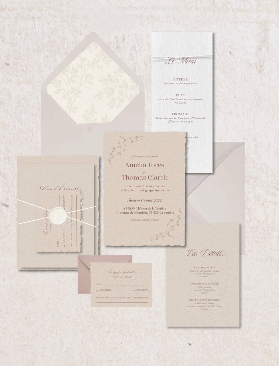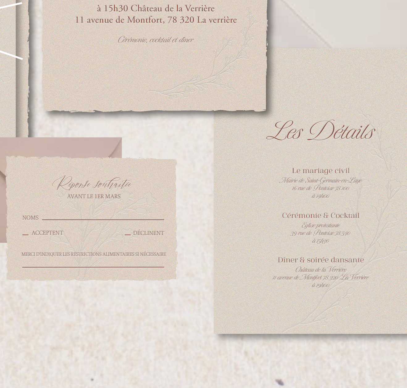 - Suite complète de 5 pièces : Faire-part, carte de détails et enveloppe, carte de réponse et son enveloppe (déclinable en y ajoutant un site web pour des réponses en ligne)